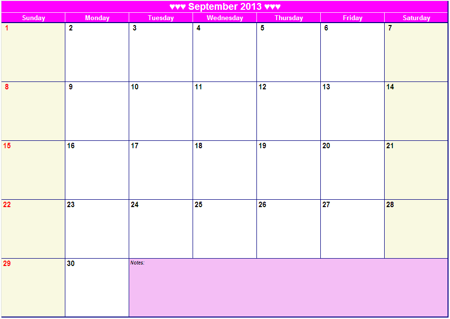 September 2013 Calendar Templates for Word, Excel and PDF