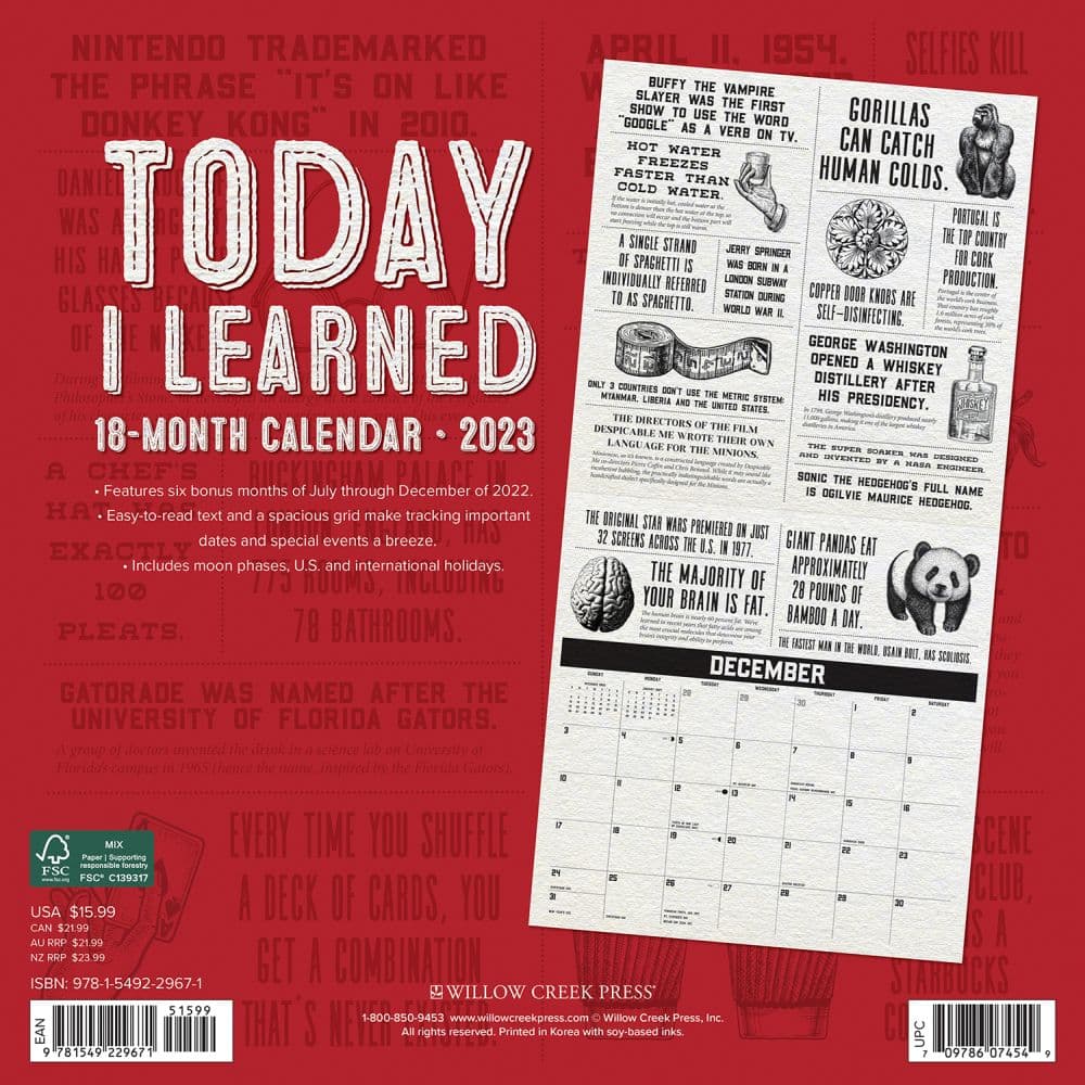 Willow Creek Press 'Today I Learned' 18Month 2023 Wall Calendar in